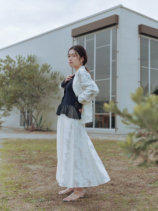 シアージャカードのジャケットとスカートのセットアップは、柔らかな風に揺れるよう。