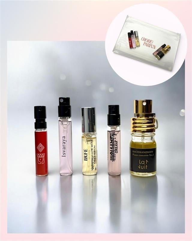 今回のテーマ「質感」より、香りを質感(テクスチャー)のオノマトペで表現した5ブランドの香りを、「モアパルファン」オリジナルポーチに入れたディスカバリーセット。