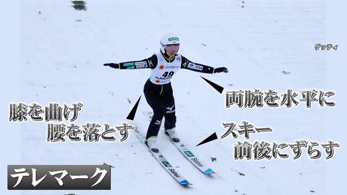 メダルへのカギは…両腕を水平に開き、両足のスキーを前後にずらして膝を曲げ、腰を落とす着地姿勢「テレマーク」。