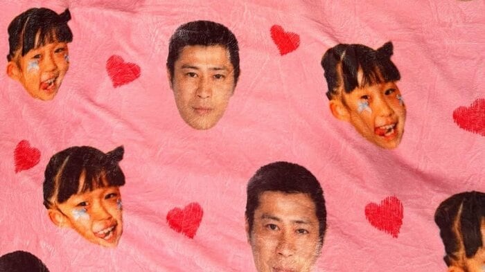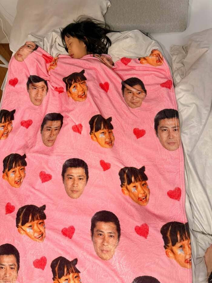 ベッドで眠るさくらちゃんに掛けられているのは、“尾形さん×さくらちゃんの顔”がデザインされたピンク色のブランケット。2人の顔が、交互に、いくつも並んでいます!