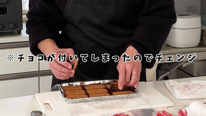 なんとか整ったため、冷蔵庫で10分ほど冷やし、まだほんの少しチョコレートが柔らかい内にクッキーを上から乗せていきますが…?