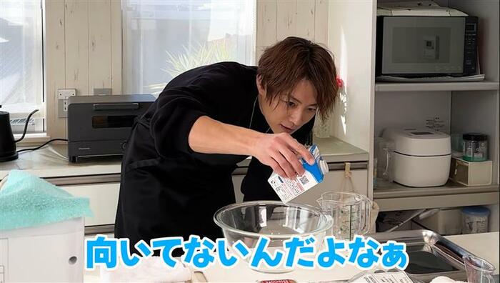 まずは、チョコレートを溶かそうと準備し始めますが、目分量でボウルに牛乳を注いでいきます。杉浦さんは「いつも目分量だからさ…スイーツって1グラム単位で決まってるやん。これがね向いてないんだよなぁ」と、きちんと測り直す場面も。