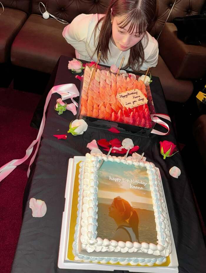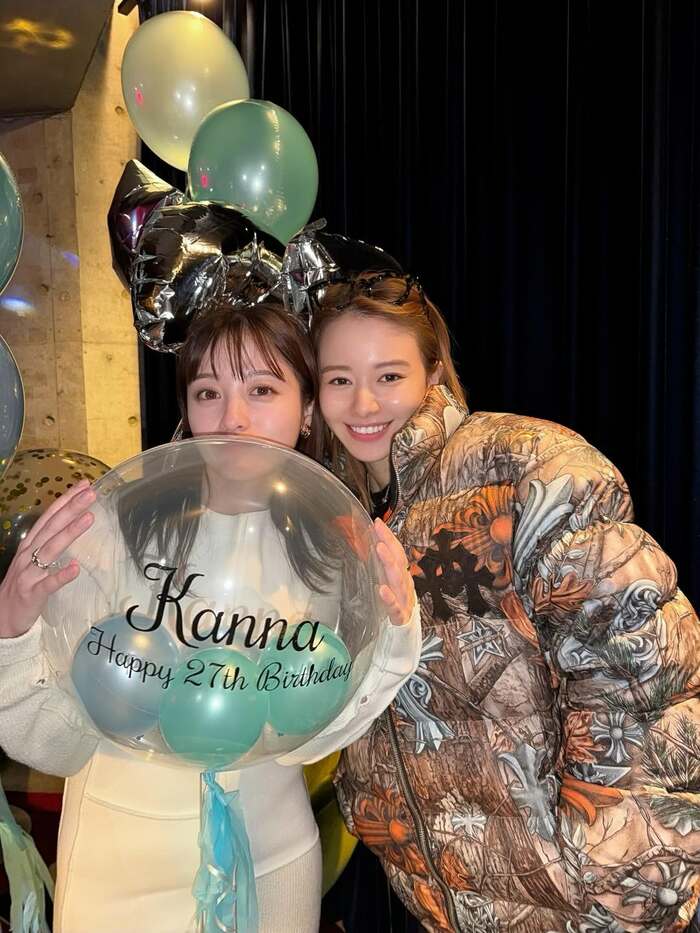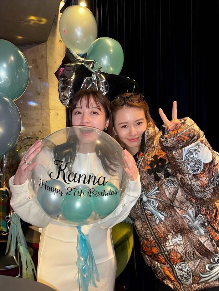 そして、「Kanna Happy 27th Birthday」と文字が入った風船を持つ橋本さんに顔を寄せる山本さんの2ショットや・・・