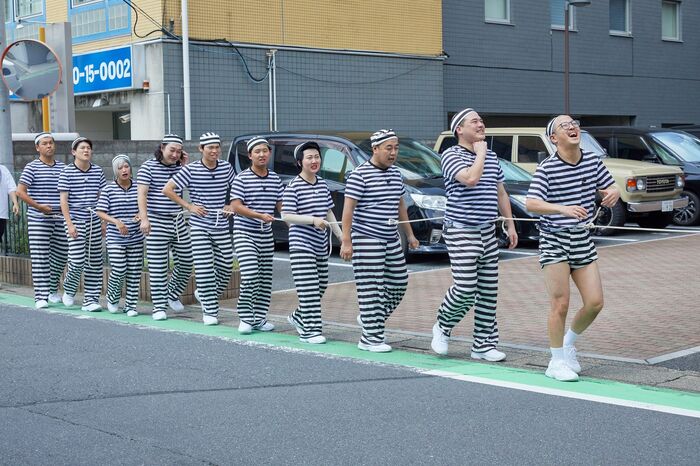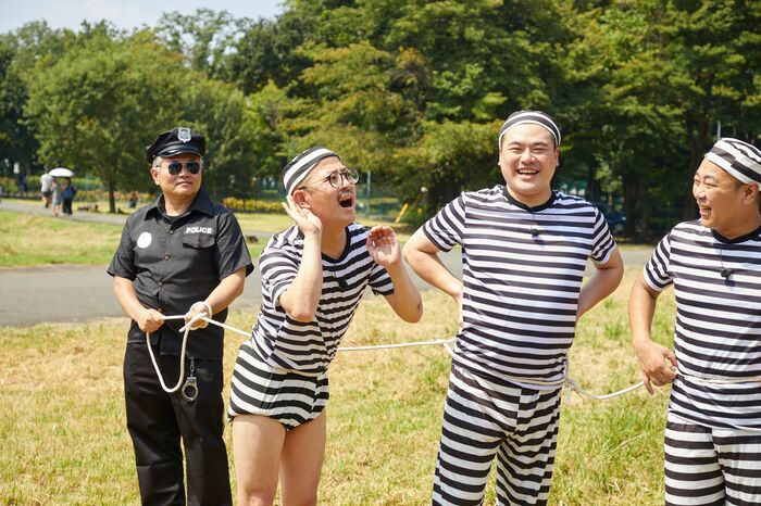 つながれたチェインギャング芸人たちがひもから解放される条件はひとつ。堀内看守が指定するシチュエーションに従い、全員で協力し「団体芸」で街の人を笑顔にすること!