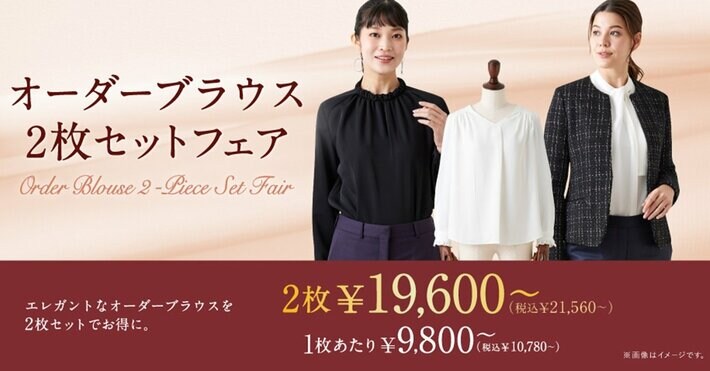 本フェアでは、ビジネスからセレモニーまで幅広いシーンで活躍するオーダーブラウスを、通常価格11,900円~(税込13,090円~)のところ、セットプランのご利用で1枚あたり9,800円~(税込10,780円~)のお得な価格でご購入いただけます。