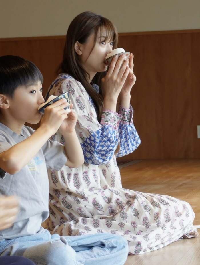 息子と並んで床に座り、まっすぐ前を見つめるヨンアさん。両手で持った器を口元に当て、さんぴん茶を飲んでいます。静かで優雅な雰囲気が漂っていて、とても素敵ですね。