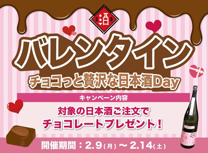 日本酒原価酒蔵全店(大阪本町店、天満店を除く)で2月9日(月)~2月14日(土)の期間中に下記対象の日本酒を単品でご注文いただいたお客様にチョコレートをプレゼントいたします。