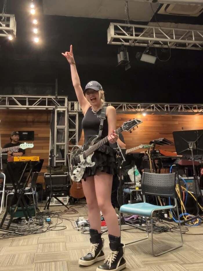 さらに、タンクトップにミニ丈ボトム、足元にはハイカットのスニーカーを合わせて帽子をかぶったスポーティーなスタイルで、ギター片手に練習しているようなショットでは、手を思い切り上にあげ、人さし指と小指を立てて「イェーイ!」と楽しそうにしています。