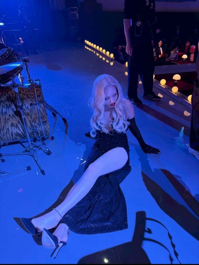 また、背中が大きく開いたきらびやかな黒のドレス姿でピアノのイスに座り、隣の男性が弾くギターとセッションしているような後ろ姿も。照明が落とされ青い光に包まれた幻想的な雰囲気がとても素敵ですね。