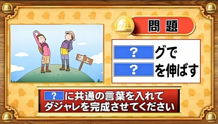 「[?]グで[?]を伸ばす」。「?」に共通する言葉を入れてダジャレを完成させてください。