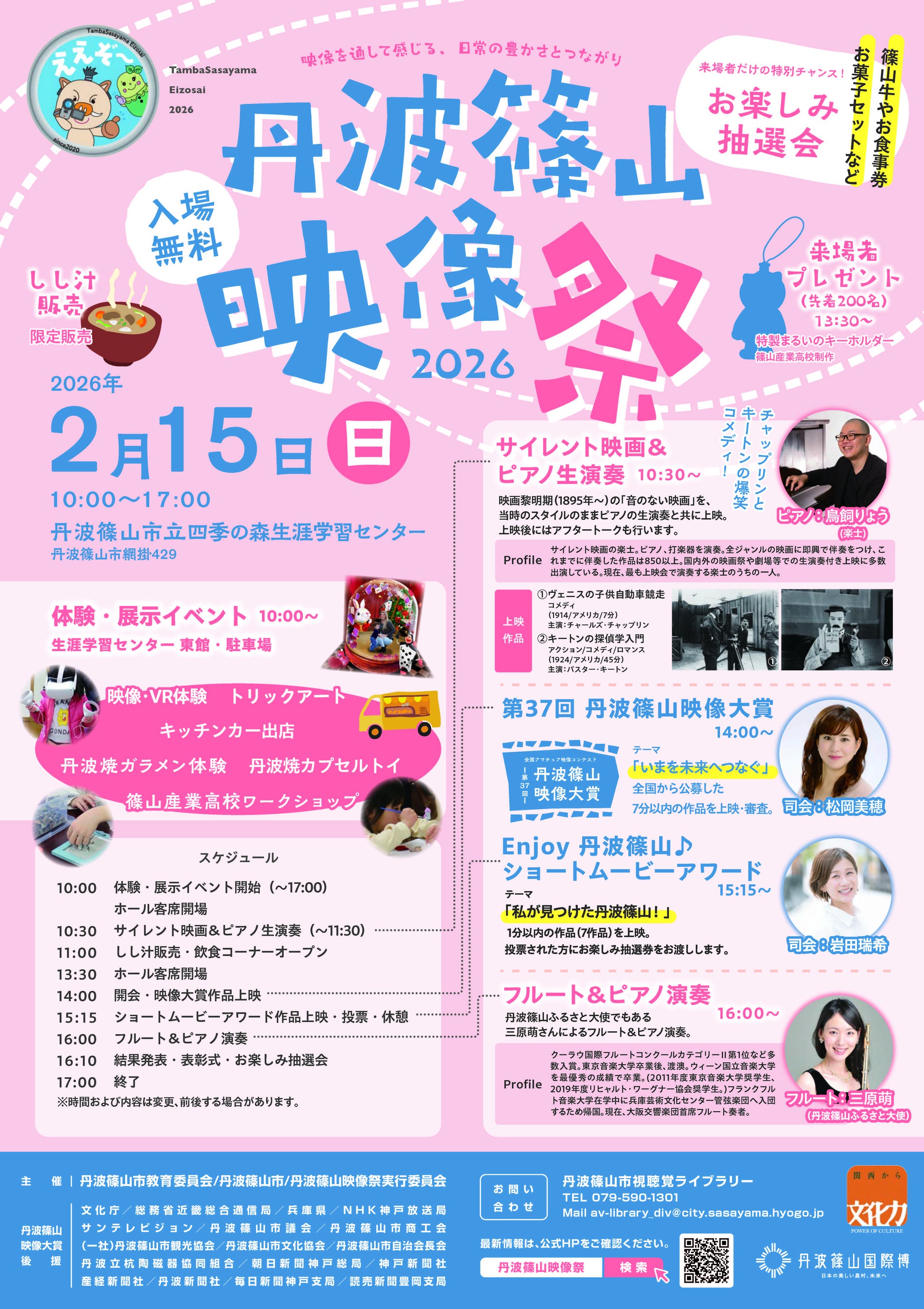 イベント内では、VR技術を使った映像体験や丹波焼コーナー、丹波篠山名物のしし汁の販売などが午前中から開催され、午後からは「第37回丹波篠山映像大賞」や「Enjoy 丹波篠山♪ ショートムービーアワード」の上映、大賞決定の表彰式など1日を通して映像作品に触れることができますので、是非ご参加ください。