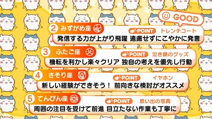 『めざましテレビ』で放送中の「ちいかわ占い」 テレビ放送がない日はお休みで、月~土:朝7時以降に更新予定です。