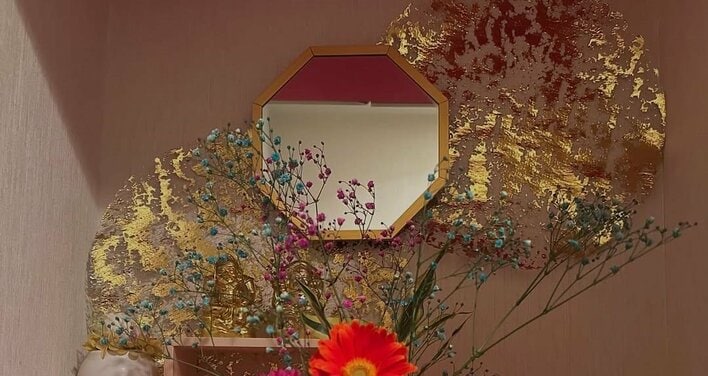 さらによく見てみると、奥には金色の壁飾りと鏡に…