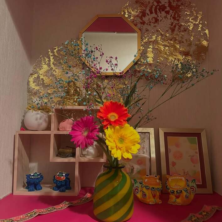 木で出来た棚には、かわいらしいシーサーの置物や、金の額縁になった写真など、様々な装飾が玄関を彩っています!棚の下がビビットなピンク色になっているのも目を引きます。