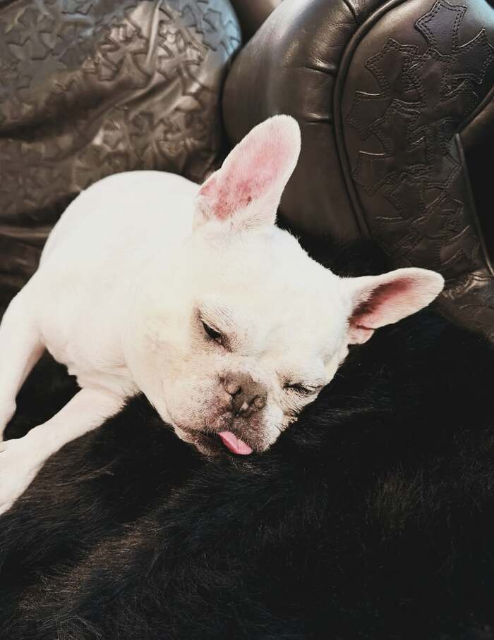 また、ふわふわな黒のファーが敷かれたソファの上で、舌を出しながら気持ちよさそうに眠る愛犬のショットも!ソファを詳しく見ると、肘掛けは十字架デザイン、後ろにも十字架デザインの黒のクッションが置かれていて、クールな雰囲気が漂っています。