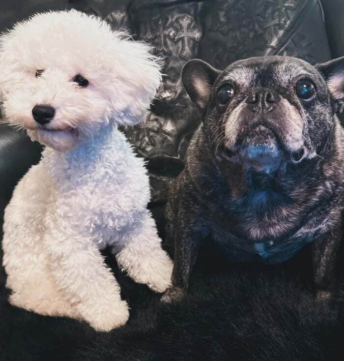 写真には、真っ黒なソファに仲良く座る、2匹の愛犬の姿が収められています。おのおの好きな方向を向いていて、自由気ままなようです。