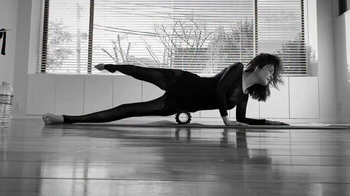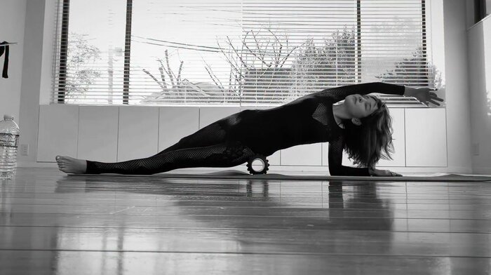 横を向き、腰辺りに置いた筋膜ローラーの上に乗りながら両手で体勢をキープしています。片足を後ろの方へと持ち上げ…。