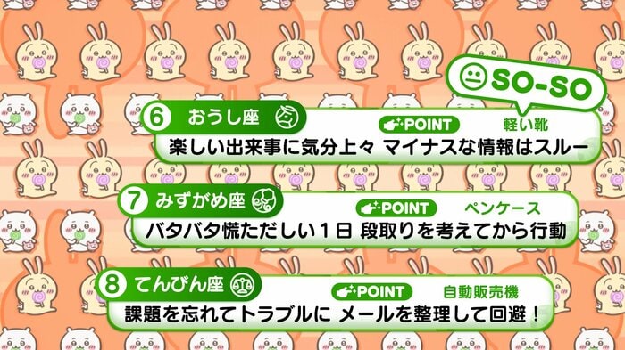 『めざましテレビ』で放送中の「ちいかわ占い」 テレビ放送がない日はお休みで、月~土:朝7時以降に更新予定です。