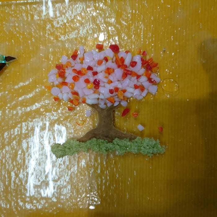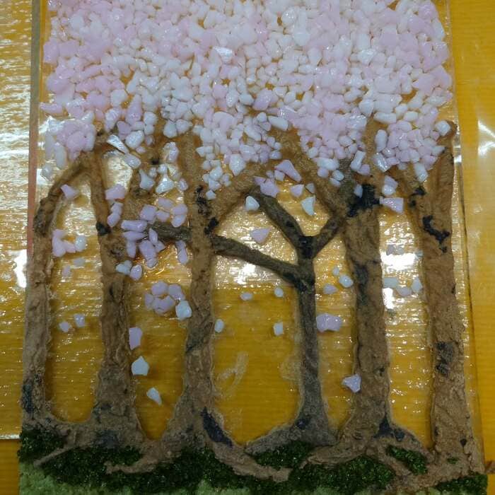 続いて「少し小さな桜に鳥」と紹介した作品では、ピンクや赤、オレンジの花びらを咲かせた小ぶりな桜の木が中央に描かれ、写真の端にはさりげなく鳥の姿も添えられています。