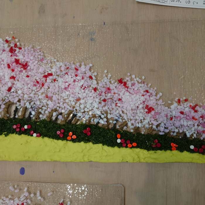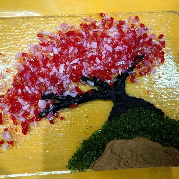 そして最後に「盆栽風の桜です」と紹介された作品では、緑色の細かなガラスで苔を表現した土台の上に、力強く伸びる幹が据えられています。枝は片側へと流れるように伸び、盆栽ならではの造形美が際立つ、静かで趣のある佇まいが印象的です。