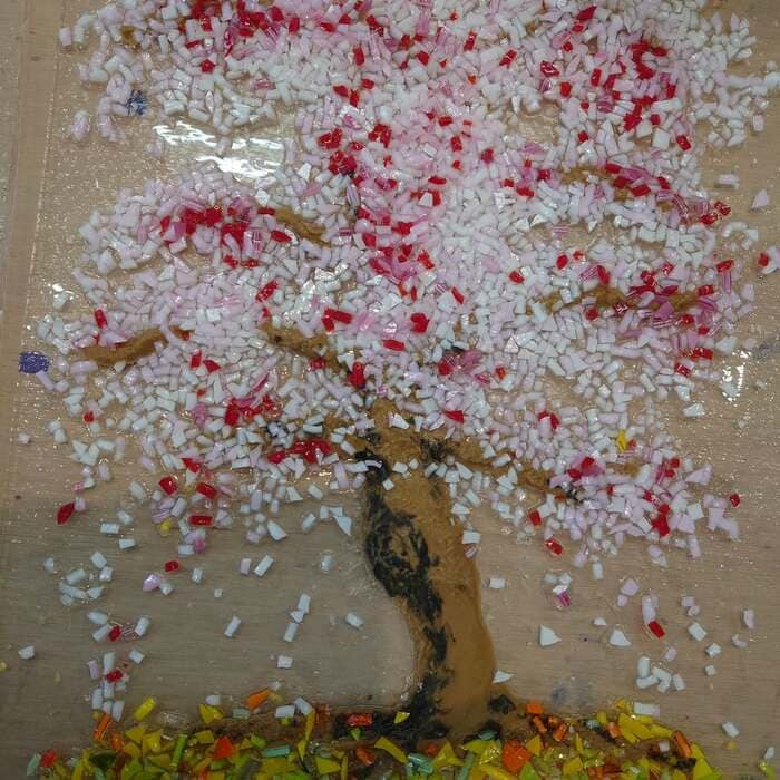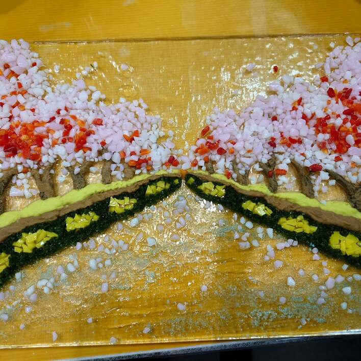 公開された写真には、満開の桜の木をモザイクで表現した作品が。白と淡いピンクのモザイク片で構成された花びらの中に、赤色がアクセントとして点在し、花びらが風に舞うような繊細な表現に、思わず見入ってしまいます。