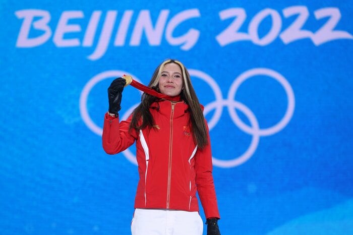 初出場となった北京冬季五輪(2022年)では、女子ビッグエアとスキーハーフパイプでそれぞれ金メダル、スキースロープスタイルでは銀メダル獲得と、当時18歳で3冠に輝きました。
