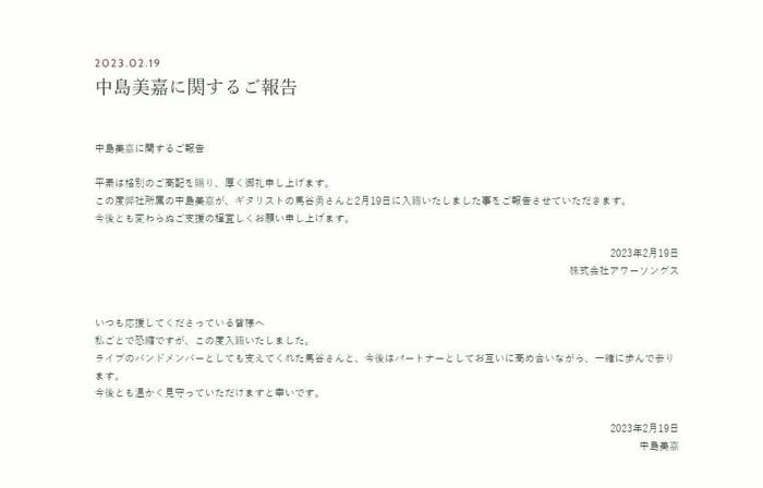 中島さんは、同日、婚姻届けを提出したことを所属事務所、公式HP、Instagramを通じて発表。「私ごとで恐縮ですが、この度入籍いたしました」とメッセージを寄せました。また、Instagramには、結婚指輪をはめた2人の手のアップを写した写真を投稿。