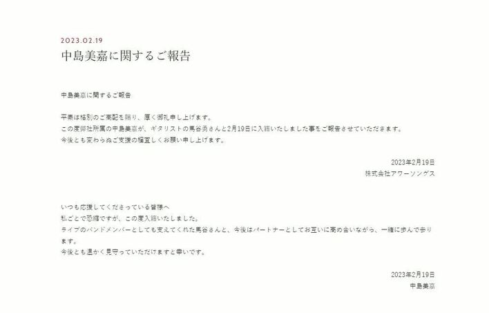 お相手は、中島さんのバンドメンバーで、ギタリストの馬谷勇(うまたに・いさむ)さん。