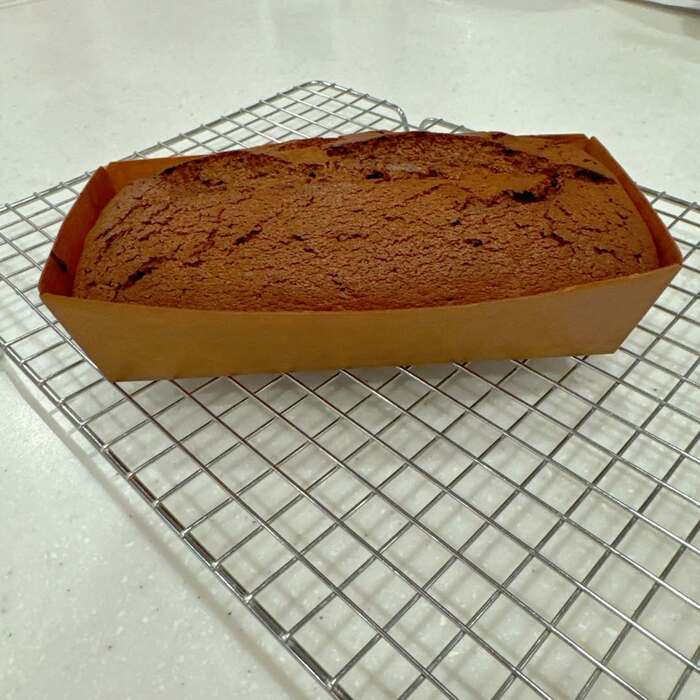 焼き上がりの写真には、ケーキクーラーの上にふっくらと焼き上がったガトーショコラが。当初は丸型で焼く予定だったそうですが、今回はパウンド型で焼いたことを明かしています。