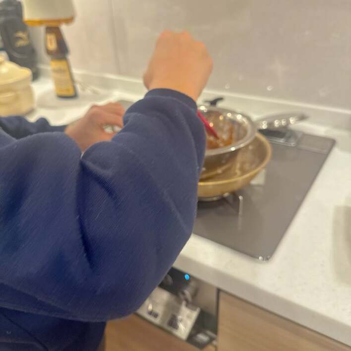 公開された写真には、ネイビーのスウェット姿でコンロの前に立ち、ボウルに入れたチョコレートを湯煎で溶かす長男の姿が写っています。