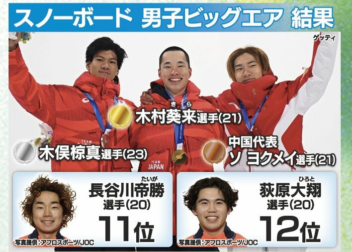 日本人選手4人全員が決勝に進出したスノーボード男子ビッグエア。木村葵来選手(21)が日本勢金メダル1号、木俣椋真選手(23)が銀メダルを獲得。日本勢ワンツーフィニッシュを果たす快挙を成し遂げました。