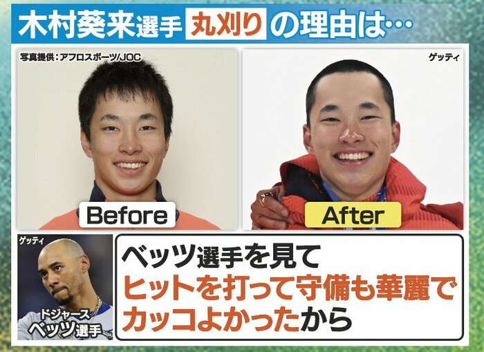「今シーズンから頭を丸めるスタイルが自分の中でもあっていて、これにしてから調子が良かった」ということで、オリンピックに合わせて横3㎜上は6㎜と丸刈りヘアで気合を入れてきたそう。表彰台で金メダルをかけられるときに帽子を取って丸刈り姿を披露した木村選手。「最高の形でこの頭を披露することができました」と語っています。