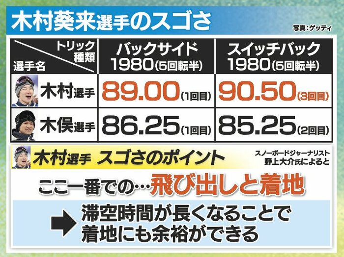 野上氏によると、木村選手のスゴさのポイントは、ここ一番での「飛び出しと着地」。滞空時間が長くなることで着地にも余裕ができると言います。