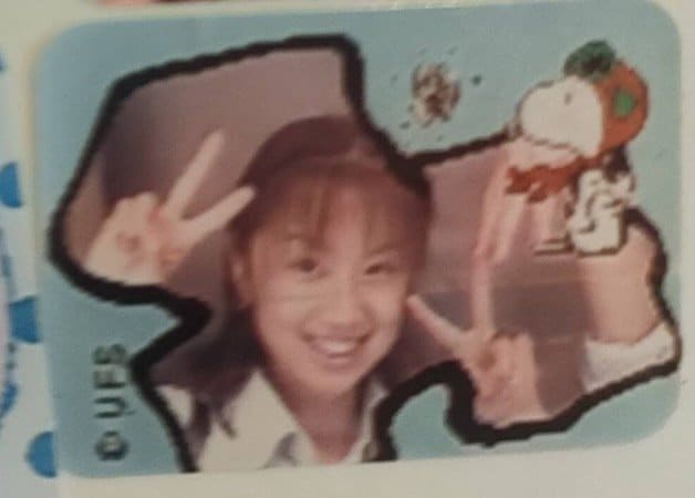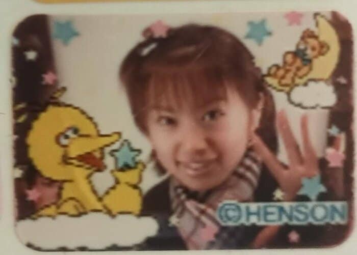 さらに、セサミストリートのビッグバードと星が描かれたフレームで撮影された別のプリクラも公開。顔の横で手を広げたポーズに、一つ結びのちょんまげヘアが、当時ならではのかわいらしい雰囲気を演出しています。