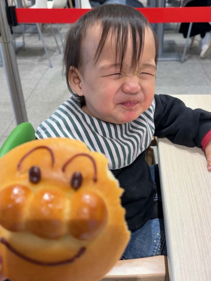 アンパンマンの顔の形に焼かれたパンと一緒に撮影したショットでは、陽太くんがくしゃっと目を細めた表情を浮かべていて、かわいらしい姿に思わずほっこりしてしまいます。