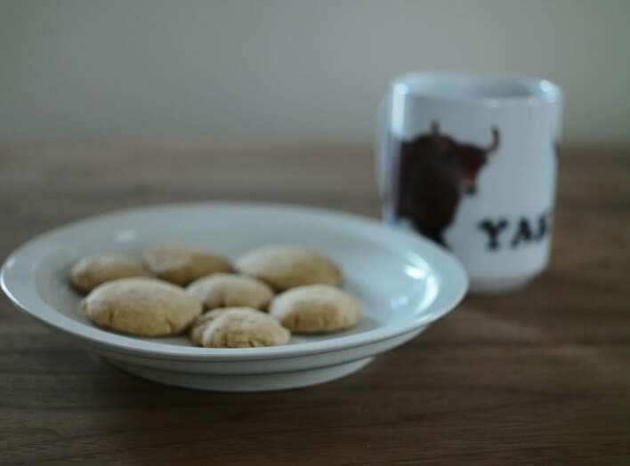 テーブルの上には白い皿に並べられたクッキーが置かれ、その奥には牛柄のマグカップが添えられています。室内に差し込む自然な明かりが、素朴な焼き色をより温かく引き立てています。