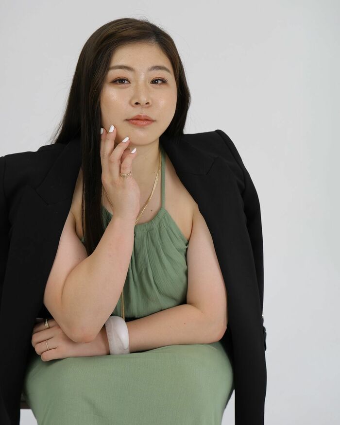 公開されたショットでは、グリーンカラーのワンピースに黒のジャケットを羽織った姿に。顔に手を添えて大人っぽい表情を見せており、柔道着姿とは異なる印象になっています。