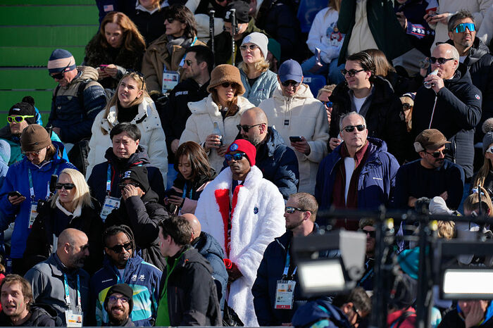 そんなスヌープさんが、女子ダウンヒルを応援するため、会場の関係者席と思われる場所に姿を見せました。