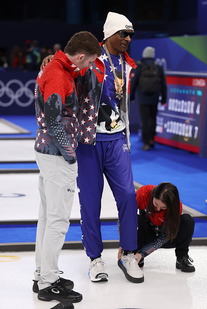 アメリカ対カナダの試合後に、リンク上でカーリングにチャレンジしたスヌープさん。