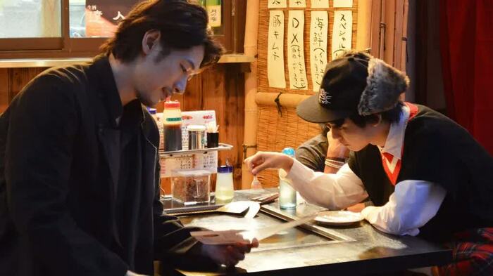 短い会話を交わすシーンということで、リハーサルはあっという間に終了。本番撮影まで、スタッフがカメラや照明の準備をする間、ディーンとゆうたろうは、ロケ場所となったもんじゃ焼き店の中で待機する。すると、そこへスタイリストさんが来て、次回以降の衣装の打ち合わせが始まった。