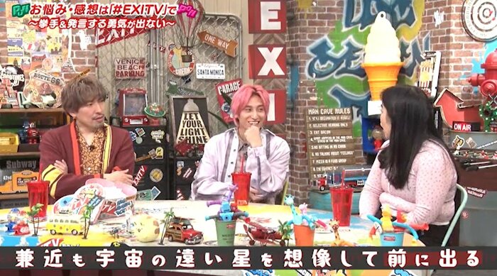 「アガらないための対策はある?」とりんたろー。さんから聞かれたゆりやんさんは、「どんなに大舞台だとしても」と切り出し、「宇宙ってめっちゃ広い…」とスケールの大きい言葉を繰り出すと、「すげー!」(りんたろー。さん)、「広がり続けていますもんね」(兼近さん)と、EXITの2人は大笑い。