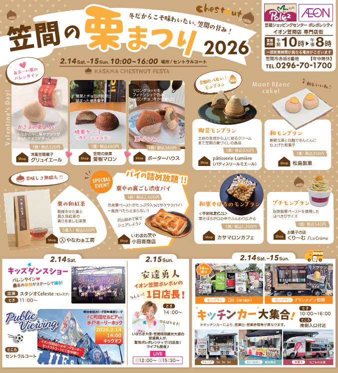 笠間の栗商品を販売するほか、水戸ホーリーホックのパブリックビューイングや笠間特別観光大使の安達 勇人さんのライブなど、企画が満載。