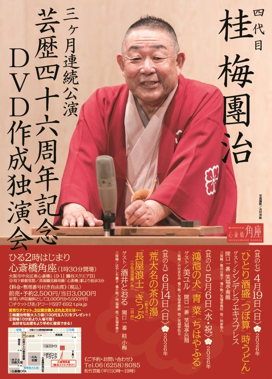 四代目桂梅團治が今年4月から6月までの3ヶ月間独演会を開催。毎月3席ずつ披露。またDVD制作第2弾も決定!おうちでも梅團治の落語を楽しめる!チケットぴあにて2/11(水・祝)10:00~全公演発売。
