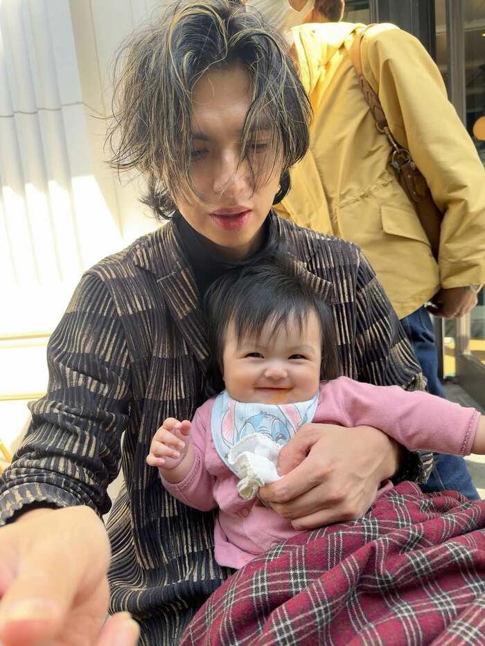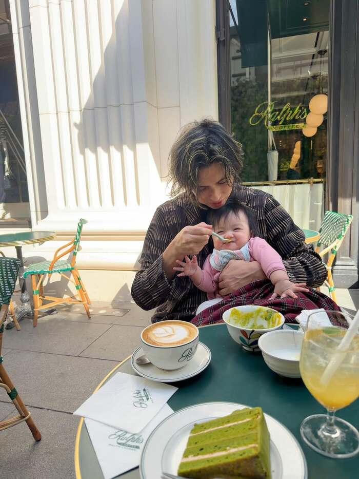 そして「カフェで離乳食」とつづり、カフェのテラス席でアレクサンダーさんが“ググガガちゃん”に離乳食をあげている様子も公開。