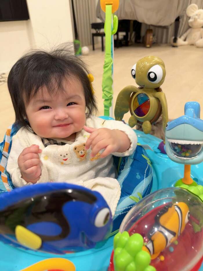 まずは「ジャンピンに乗るグー」とつづられたショット。“ググガガちゃん”はディズニー映画『ファインディング・ニモ』のデザインが施された遊具に座り、ふにゃっととろけるような笑顔でカメラを見つめています。今にもこぼれ落ちそうなぷくぷくのほっぺやむちっとした手が、なんとも愛らしいですね。