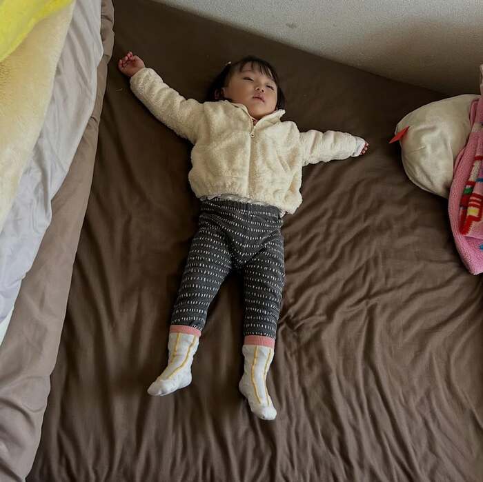 かと思えば、おうちの布団の上で、大胆に両手をバンザイして、気持ちよさそうに大の字で眠ったりと、豊かな表情がとってもかわいらしいんです。