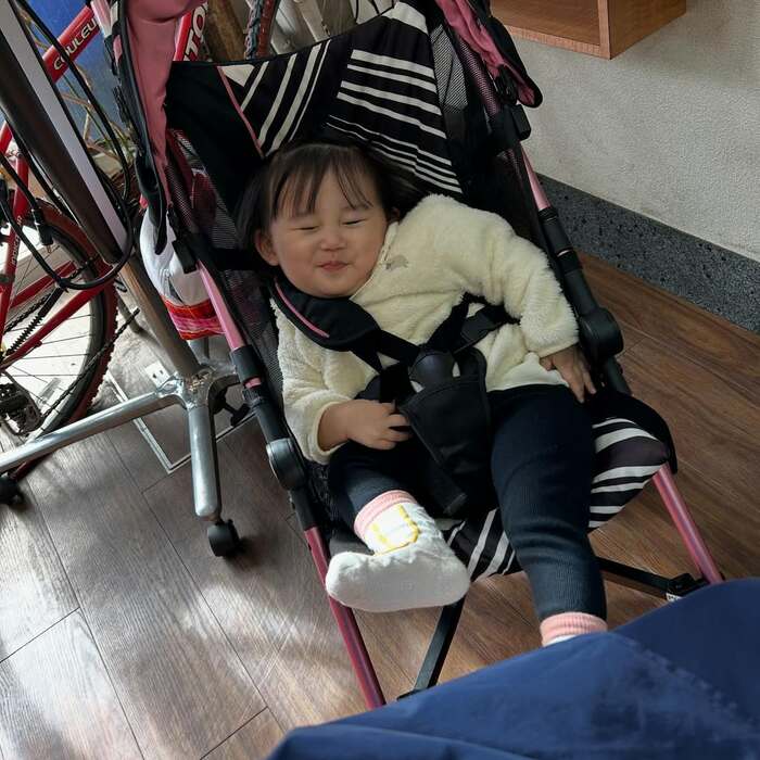 ベビーカーに座りながら目をぎゅっとつむったおちゃめな表情で、楽しそうに片足を上げたまさにひょうきんなポーズを決める様子も!