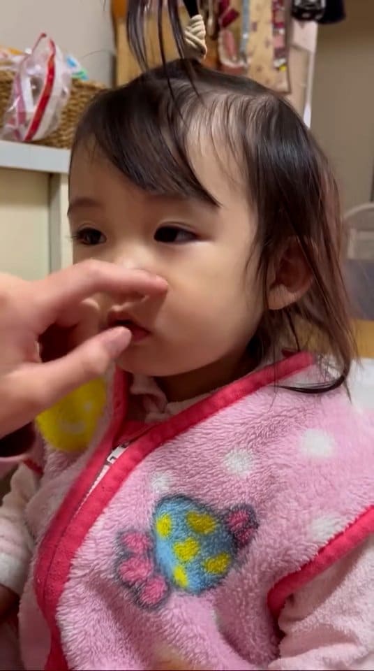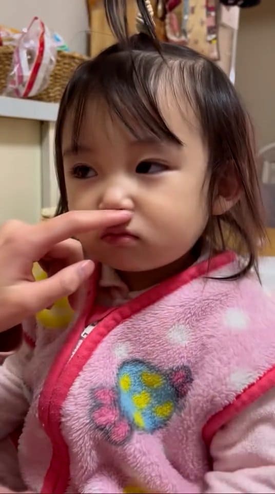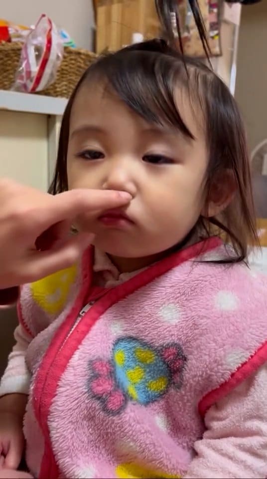 そして、お姉ちゃんの指は「なちぶー」ちゃんの鼻をそーっとなでていきます。すると…