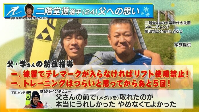 そんな二階堂選手の父・学さんについて、二階堂選手の大学時代の先輩でもある、スキージャンプ・藤田慎之介選手によると、二階堂選手の才能を分かっていたからこそ、とても厳しく熱血指導だったそうです。