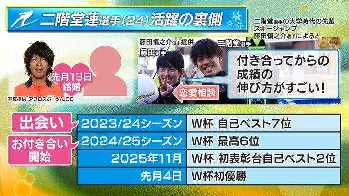 1月13日に結婚したばかりの二階堂選手。二階堂選手は付き合う前から藤田選手に恋愛相談をしていて、藤田選手によると、「付き合ってからの成績の伸び方がすごい!」といい、1月4日にはW杯初優勝も果たしています。